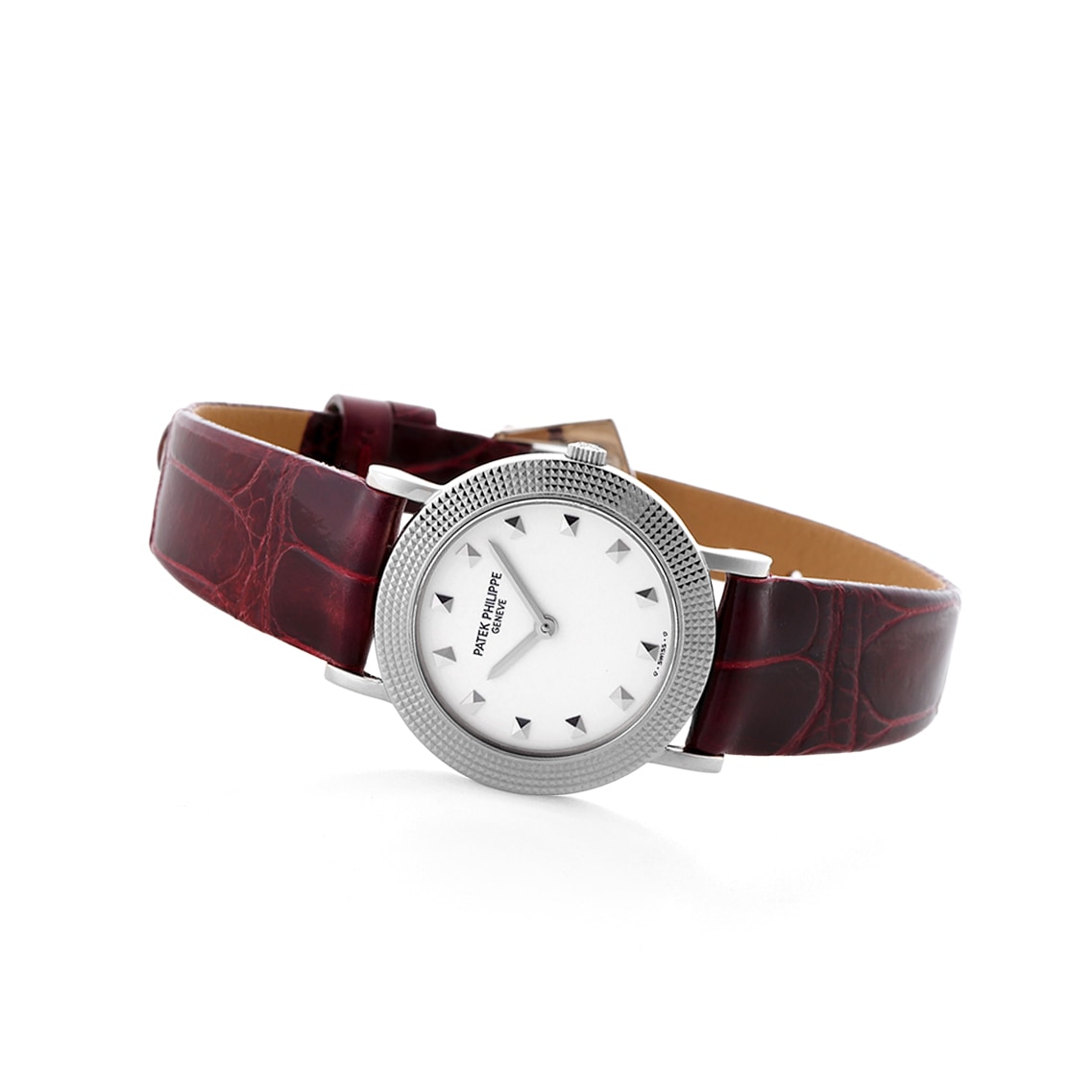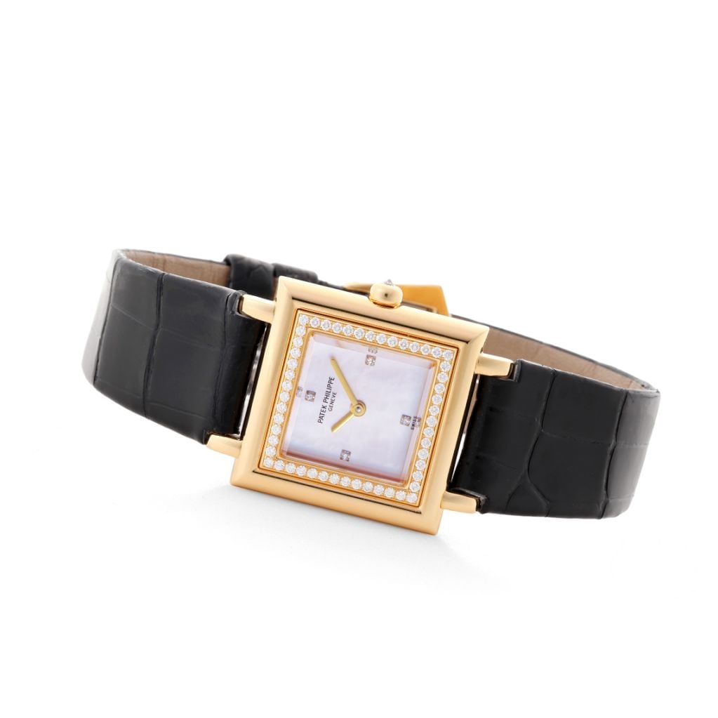 四角いケースにブラウン文字盤が可愛らしく、ケースの角は柔らかな丸みを帯びており、パテック社の強い意匠(デザイン)で凝っています。